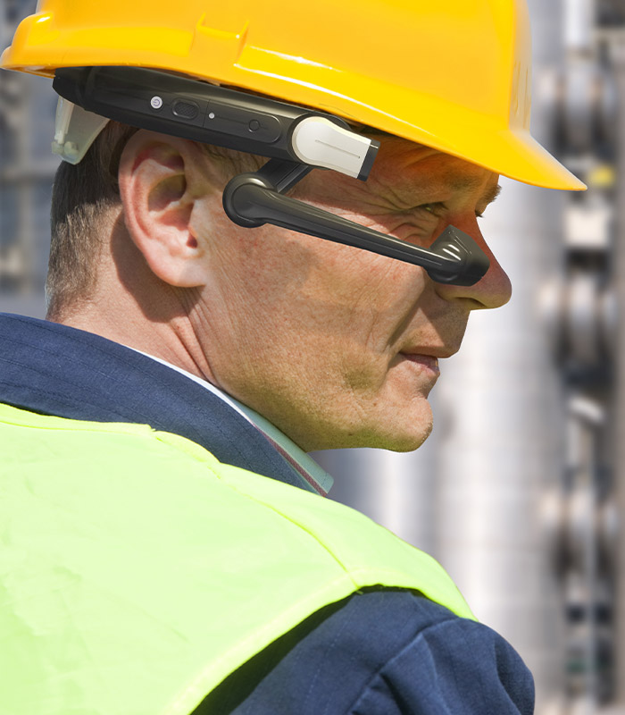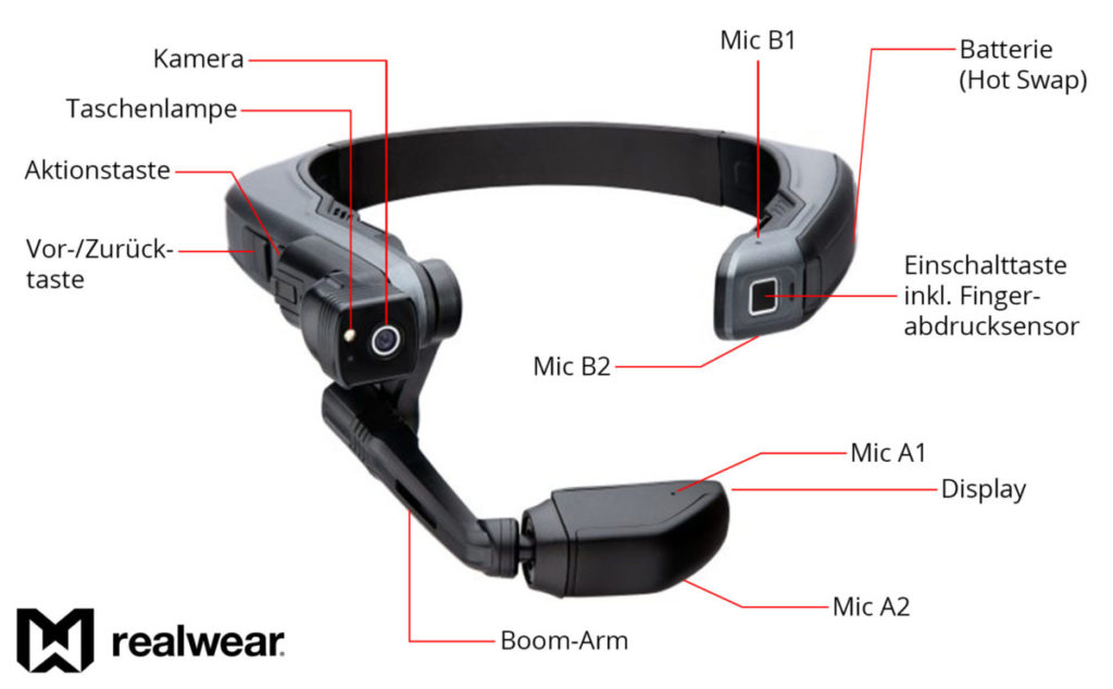 Datenbrillen wie RealWear Navigator 520 oder Vuzix M400 sind zwischen Standardplattformen und AR anzusiedeln. Bitnamic spricht hierbei von AR light, da keine direkte Realitätsüberlagerung erfolgt. Die Datenbrillen selbst verfügen über einen im peripheren Sichtfeld situierten 2D-Assistenzbildschirm. Bild: Bitnamic