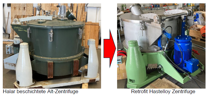 Als Spezialist für Retrofit-Projekte in der Prozessindustrie, insbesondere bei Anlagen für die Fest-Flüssig-Separation, hat die Second First GmbH zahlreiche Retrofits durchgeführt, bei denen noch nutzbare und wertvolle Anlagenkomponenten (wie z.B. Stator, Pendelstützen, Trocknerteller, Trommeln…) nach kompletter Maschinenzerlegung und Überholung weitergenutzt, während alle Ventile, Sensoren, Federn, Verschleißteile und Sicherheitsinstrumente erneuert wer den. Das ist deutlich günstiger und auch nachhaltiger als die Neuanschaffung einer entsprechenden Anlage. Ein konkretes Beispiel: Bei einer hochwertigen Zentrifuge aus den 1980er Jahren wurde die aus Hastelloy gefertigte Zentrifugentrommel beibehalten, während das Gehäuse und der Stator, die aus Normal-stahl mit PU-Beschichtung (gegen aggressive chemische Substanzen) bestanden, gegen Neuteile mit Hastelloy-Auskleidung getauscht wurden. Damit erlebt die wertvolle Trommel ein „Second life“. Und der Anwender hat Investitionskosten gespart.