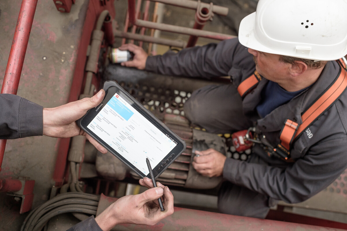 Digitale Unterstützung in der Instandhaltung: Mitarbeitende der Wisag Produktionsservice GmbH bei der sicherheitstechnischen Kontrolle – vernetzt, dokumentiert und praxisnah vor Ort. Bild: Wisag